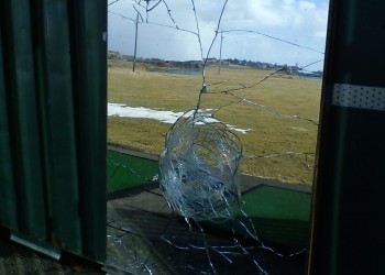 Speglar í kennarabás voru brotnir og rusl og brotnar kylfur lágu á víð og dreif um svæðið þegar kylfingar mættu þangað á laugardagsmorgni.