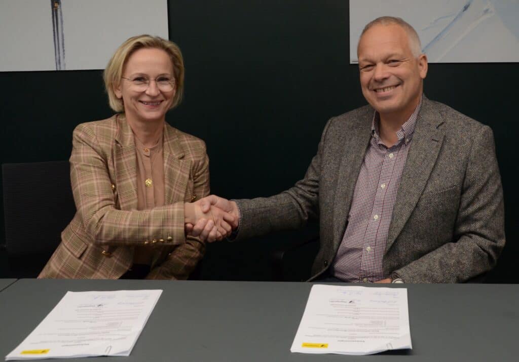 Bergþóra Þorkelsdóttir, forstjóri Vegagerðarinnar og Karl Andreassen, framkvæmdastjóri Ístaks skrifuðu undir verksamninginn um smíði brúar yfir Stóru-Laxá í gær. Ístak mun hefja vinnu strax á mánudag og vinna við verkið í allan vetur.