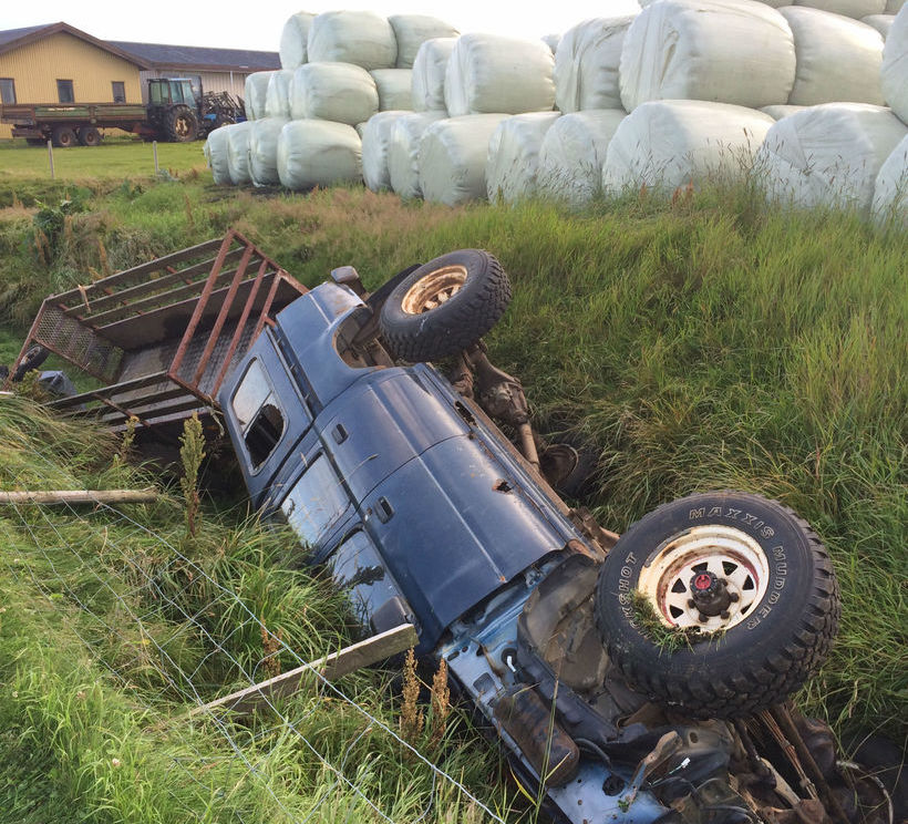 Stór jeppi með kerru hafði þeyst út í skurð, grindverk höfðu lagst á hliðina og járnplötur fokið hundruð metra þegar heimilisfólk í Norðurhjáleigu í Áftaveri kom heim í dag.