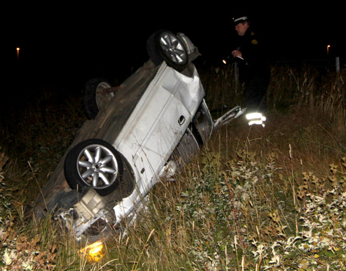 Slysið átti sér stað á ellefta tímanum við afleggjarann í Tjarnarbyggð. Bifreiðin endastakkst útaf veginum og hafnaði ofan í skurði.