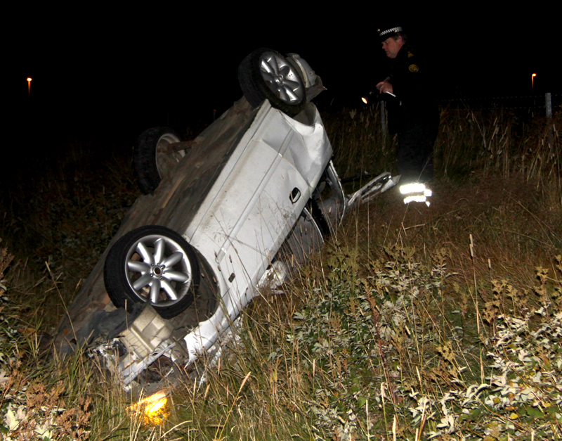 Ökumaður fólksbifreiðar slapp með minniháttar meiðsli eftir að hafa velt bíl sínum út fyrir Eyrarbakkaveg í kvöld.
