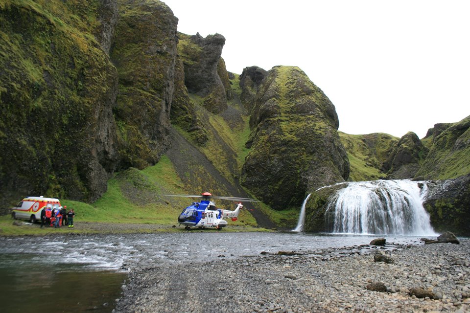 Þyrlan lenti við mjög erfiðar aðstæður í þröngu gilinu og flaug svo innar í það til að ekki þyrfti að aka með konuna, sem talin er alvarlega slösuð, í sjúkrabílnum eftir ósléttu gilinu að þyrlunni. Hún flytur nú konuna á sjúkrahús í Reykjavík.