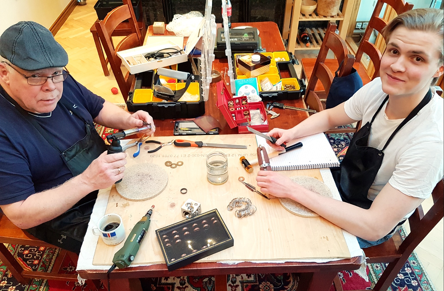 Árni segir að í kjölfarið hafi þeir félagarnir farið á silfursmíðanámskeið í Handverkshúsinu til að læra grunninn að skartgripagerð. „Síðan var það bara að prufa sig áfram og læra af mistökunum. Við byrjuðum heima á eldhúsborðinu hans afa og erum núna að koma okkur upp endanlegri aðstöðu,“ segir Árni og bætir því við að þeir sjái jafnt um að hanna og smíða skartgripina. „Afi og ég höfum alltaf haft áhuga á hönnun. Við höfum alltaf verið að búa eitthvað til og skapa,“ segir Árni.