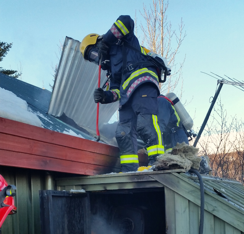 Snarræði slökkviliðsins bjargaði því að ekki fór verr því þegar þeir komu á staðinn var töluverður eldur í utanáliggjandi geymslu auk þess sem eldur var kominn í þak og inn í húsið.
