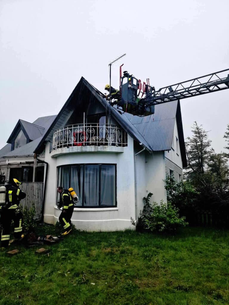 Nágrannar, sem höfðu vaknað við brothljóð og hvelli frá eldinum, drógu síðan fram garðslöngu og slökkvitæki og héldu eldinum í skefjum þar til slökkviliðið mætti á vettvang.