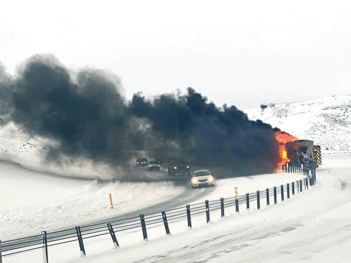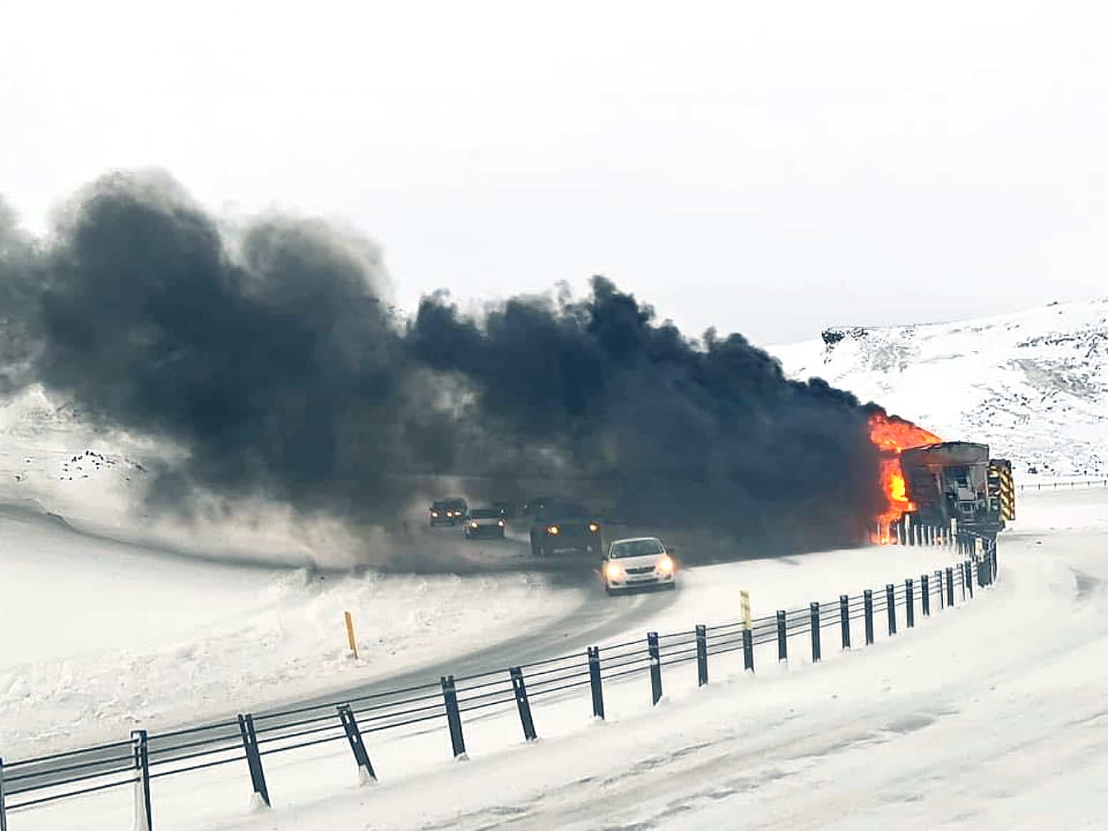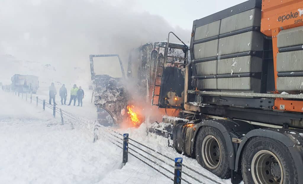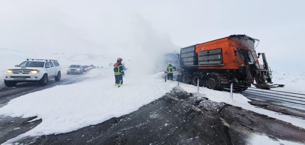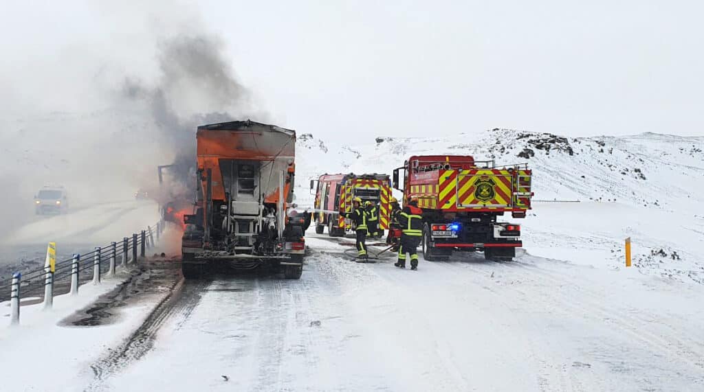 „Þetta er vörubíll með snjótönn og tilheyrandi búnaði. Hann varð alelda og mínir menn eru að ljúka slökkvistarfi í þessum töluðu orðum. Þetta er stórt tæki og það verður mikill eldur í þessu og svartur reykur,“ sagði Pétur Pétursson, slökkviliðsstjóri Brunavarna Árnessýslu, í samtali við sunnlenska.is um klukkan 17.
