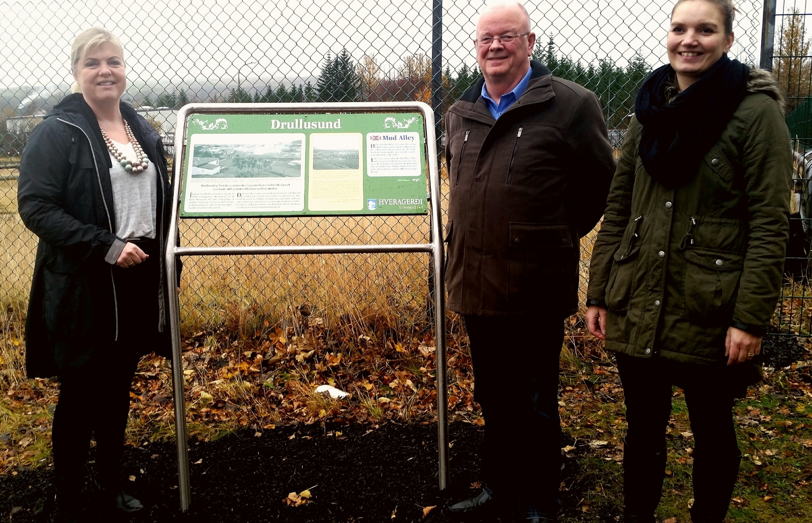 Nýtt söguskilti við Drullusund var afhjúpað í Hveragerði í vikunni. Söguskiltin í bænum eru nú orðin níu talsins og hafa þau vakið mikla athygli.