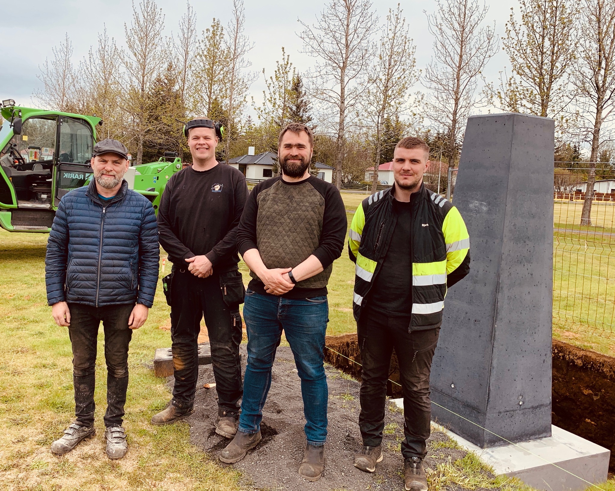 Stöpullinn fyrir afsteypu af styttu Nínu Sæmundson, Afrekshugur, hefur verið settur á sinn stað á miðbæjartúninu á Hvolsvelli.