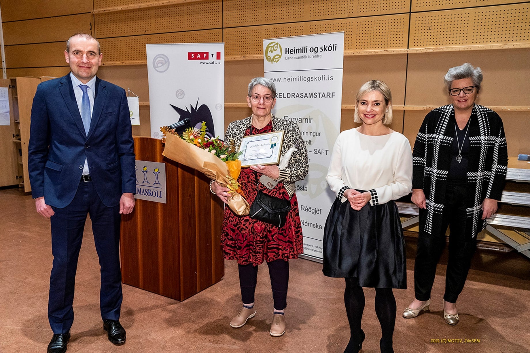 Verðlaunaafhending fór fram í Rimaskóla í Grafarvogi í morgun og þar afhenti Lilja D. Alfreðsdóttir, mennta- og menningarmálaráðherra, Guðríði verðlaunin. „Verðlaunin eru hvatning til náms- og starfsráðgjafa og umsjónarkennara til góðra verka. Þessir starfsmenn bera iðulega hita og þunga í eineltismálum. Guðríður hefur unnið frábært starf og ávallt beitt árangursríkum aðferðum,“ sagði Lilja.