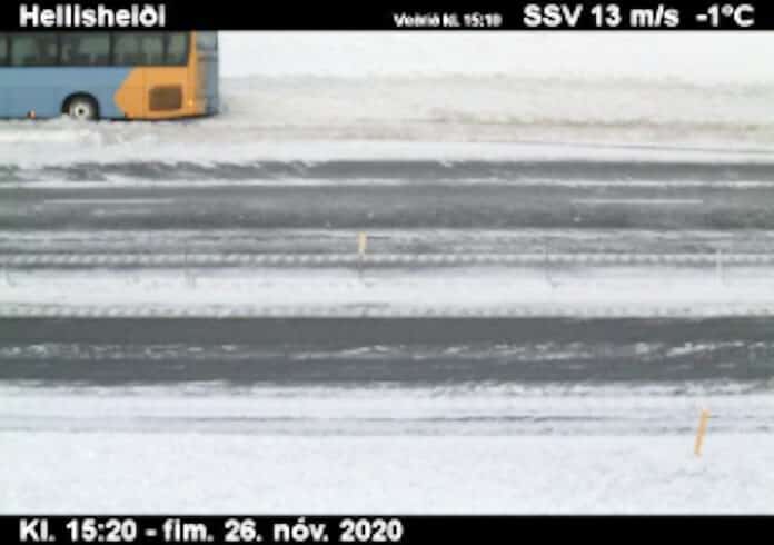 Hálka er á Hellisheiði og gengur á með dimmum hríðaréljum.