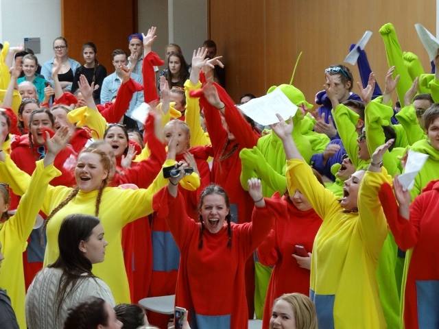 Fjölbrautaskóli Suðurlands fylltist af syngjandi rauðum, grænum, fjólubláum og gulum Stubbum síðastliðinn föstudag.