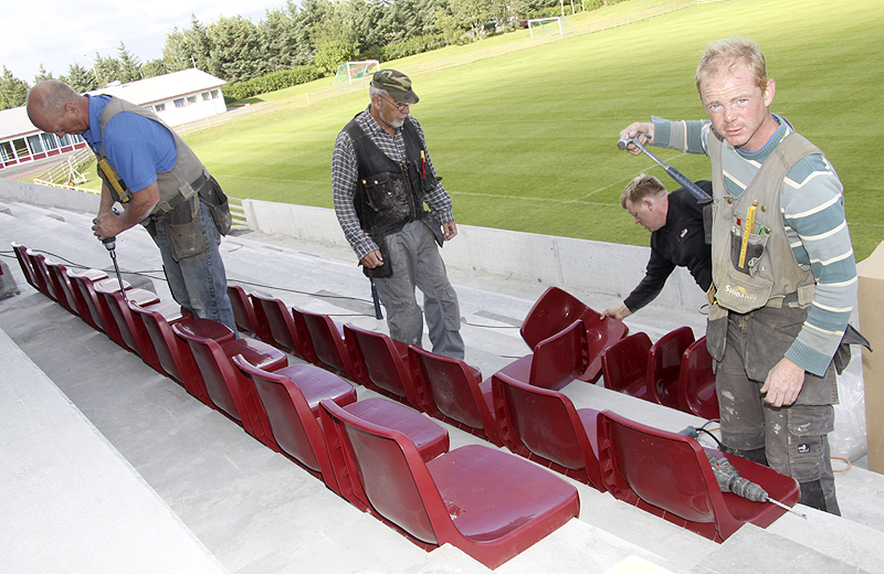 Starfsmenn Smíðanda hófu að festa sætin í stúkuna í morgun og voru rúmlega hálfnaðir við það verk síðdegis í dag. Þegar sætin eru komin í á eftir að setja upp handrið og ganga frá umhverfis stúkuna til þess að fyrsta áfanga teljist lokið.