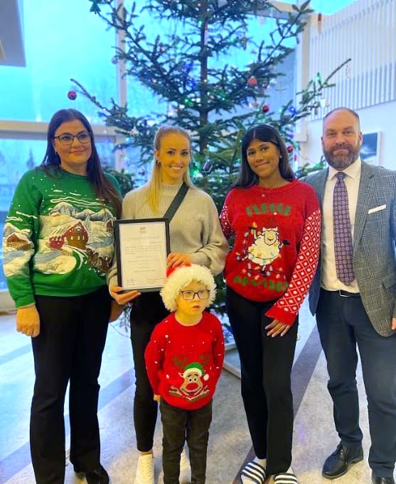 Nishadi U. Weerasooriya, formaður nemendaráðs og Maríus Blær Irpu Davíðsson, yngsti nemandi skólans, afhentu Öddu Maríu Óttarsdóttur, fulltrúa Einstakra barna í morgun styrk að fjárhæð 2.184.000 króna.