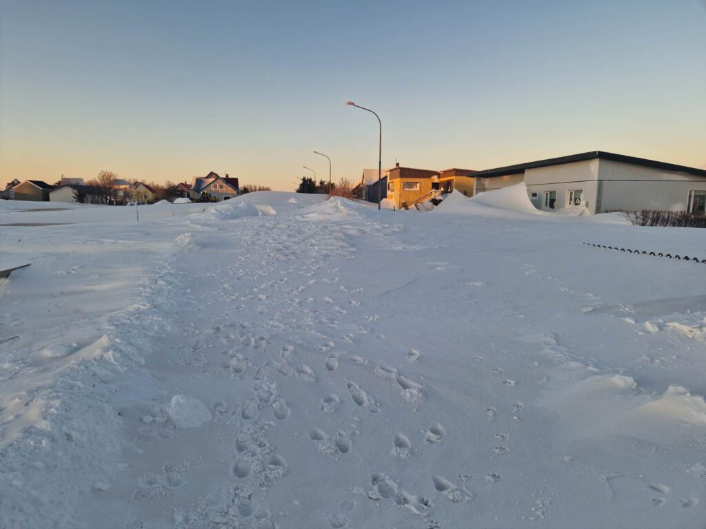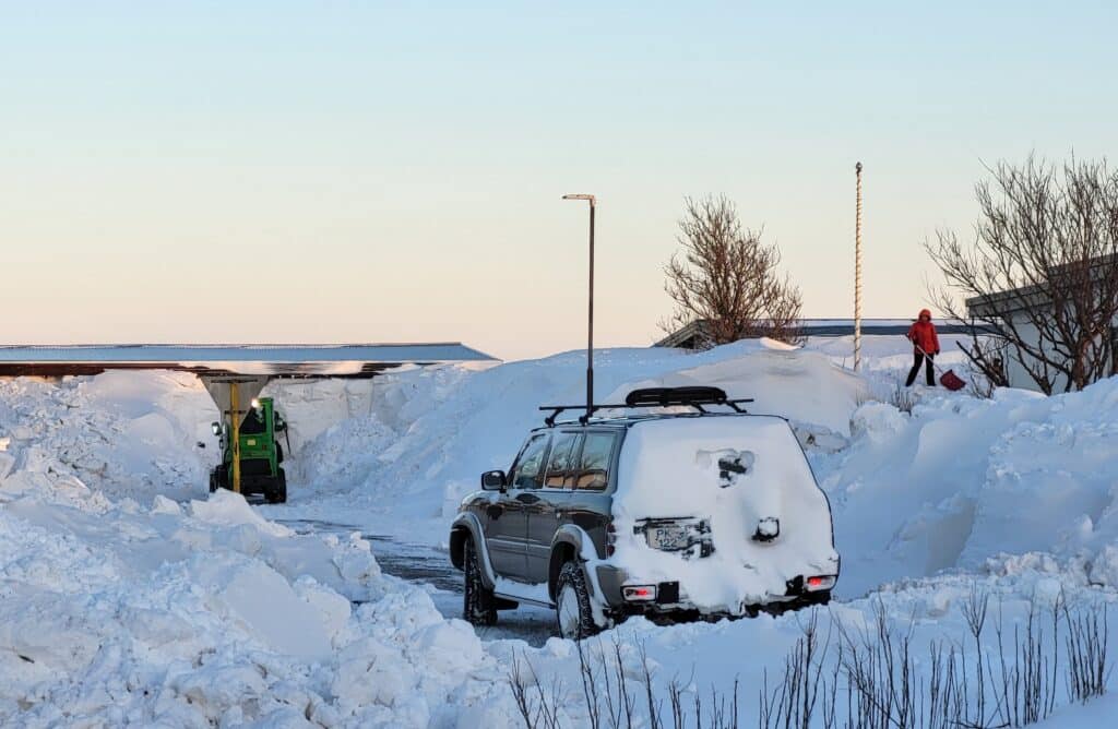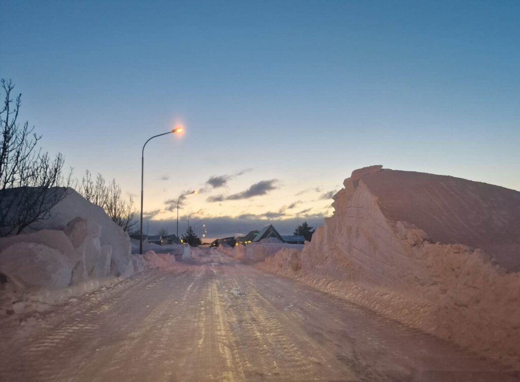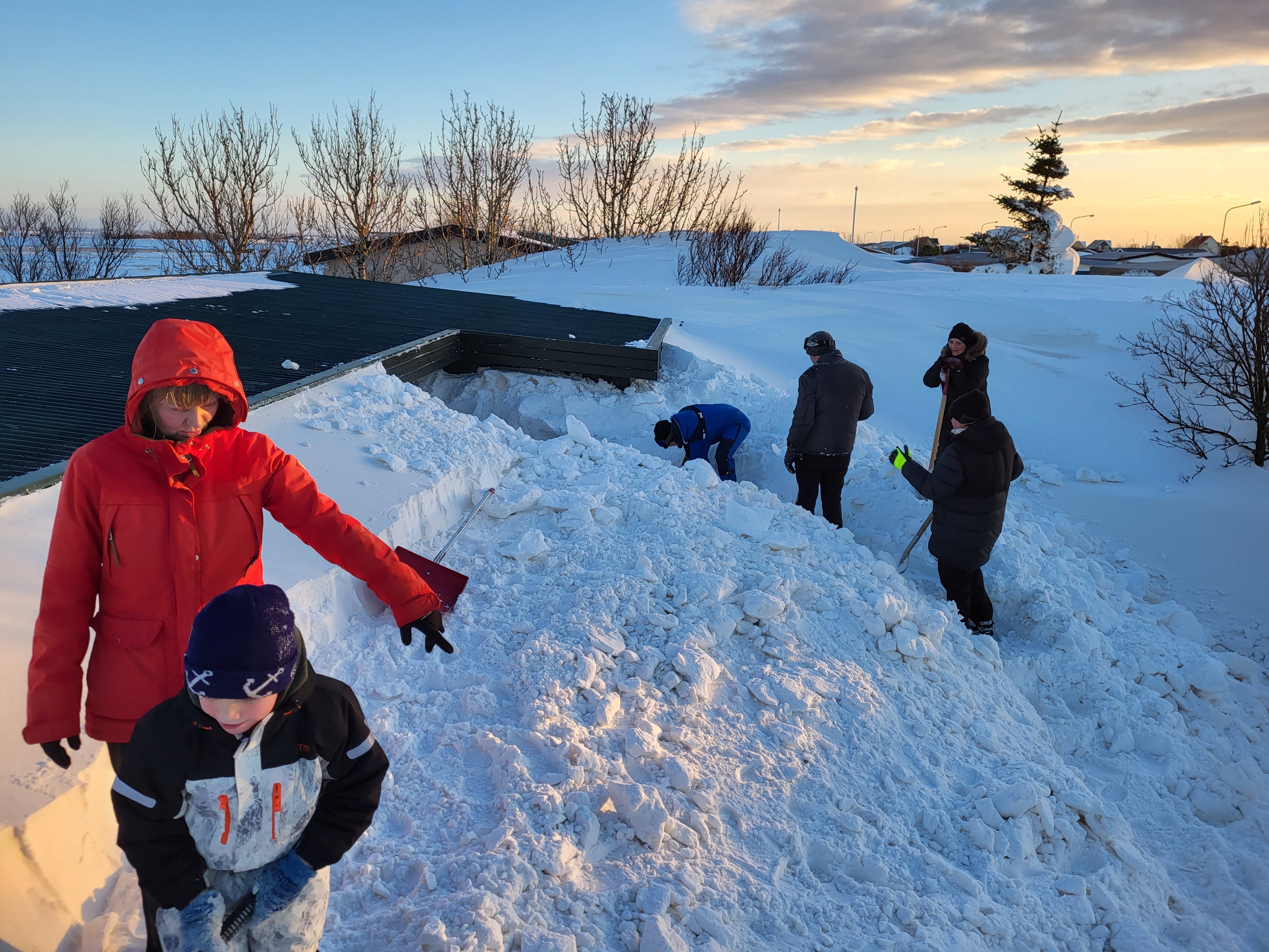 „Það er mikið af góðu fólki hérna í kringum okkur, fyrst komu fimm lögregluþjónar og svo bættust við vinir og nágrannar. Það var meira að segja lokað einni deild á leikskólanum og börnin færð á aðra deild og starfsfólkið kom hérna yfir til okkar og hjálpaði til. Þetta var mikill léttir og við erum glöð að sjá loksins upp í himininn,“ bætti Emma við og að sjálfsögðu bauð hún fólkinu upp á kaffi og vöfflur með rjóma að mokstri loknum.