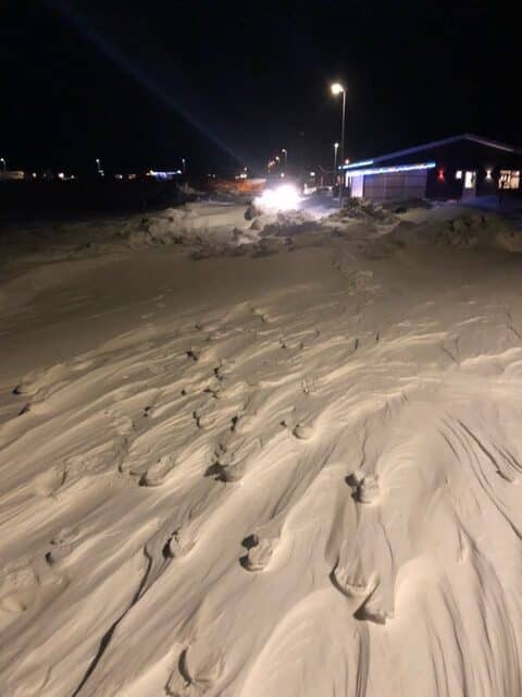 Túngatan hefur verið algjörlega ófær frá því á laugardag og tilraunir til snjómoksturs skiluðu litlum árangri, fyrr en í gær þegar loksins lægði vind og stórvirkar vinnuvélar gátu tekið til óspilltra málanna, en þær áttu fullt í fangi með moksturinn.