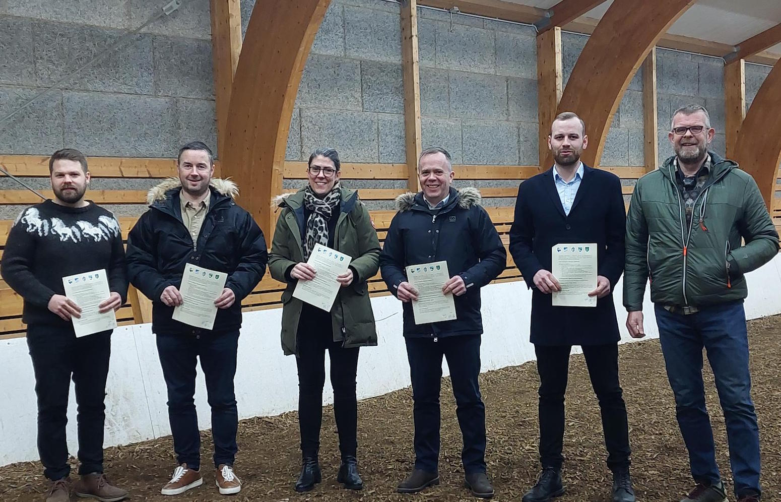 Í samningnum, sem gildir út árið 2026, er kveðið á um árlegan fjárhagslegan stuðning sveitarfélaganna við félagið. Á myndinni, sem var tekin í reiðhöllinni á Flúðum, eru forsvarsmenn sveitarfélaganna og forsvarsmenn Hestamannafélagsins Jökuls.