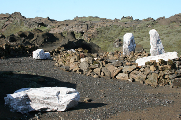 Um er að ræða stóra, hvíta gervisteina úr gipsi og vírneti, sem liggja innan um grjót sem einnig var flutt á staðinn og stingur nokkuð í stúf við annað í náttúrunni þar.