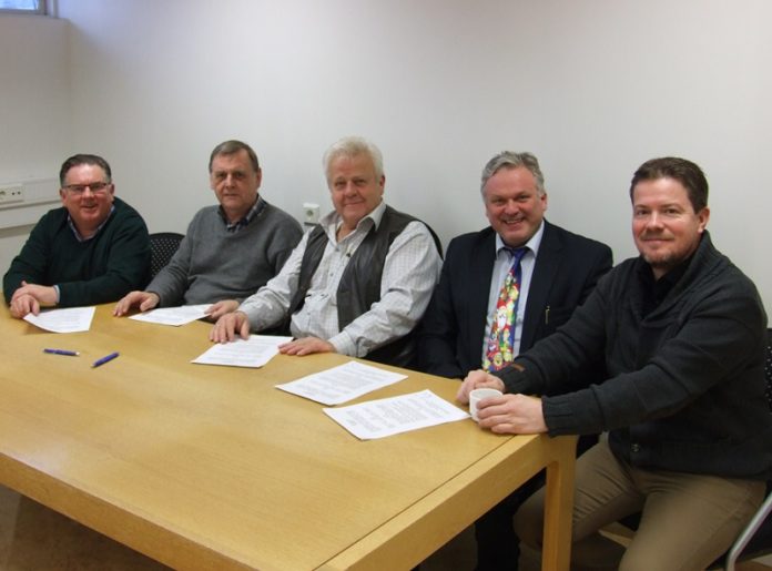 Á meðfylgjandi mynd sem tekin var í Miðjunni á Hellu við undirritun samningsins skrifa þeir Ísólfur Gylfi Pálmason sveitarstjóri, Ágúst Ingi Ólafsson stjórnarformaður Sorpstöðvarinnar, Sveinn Runólfsson forstjóri Landgræðslunnar, Ágúst Sigurðsson sveitarstjóri og Björgvin G. Sigurðsson, sveitarstjóri, samninginn nú í morgun.