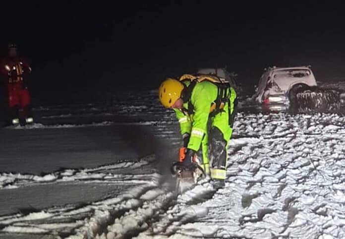 Í gærkvöldi héldu fjórir félagar Hjálparsveitarinnar Tintron í Grímsnesi til aðstoðar eigenda tveggja bifreiða sem höfðu farið niður um ís í gærdag á Eyfirðingavegi, sunnan Skjaldbreiðar.