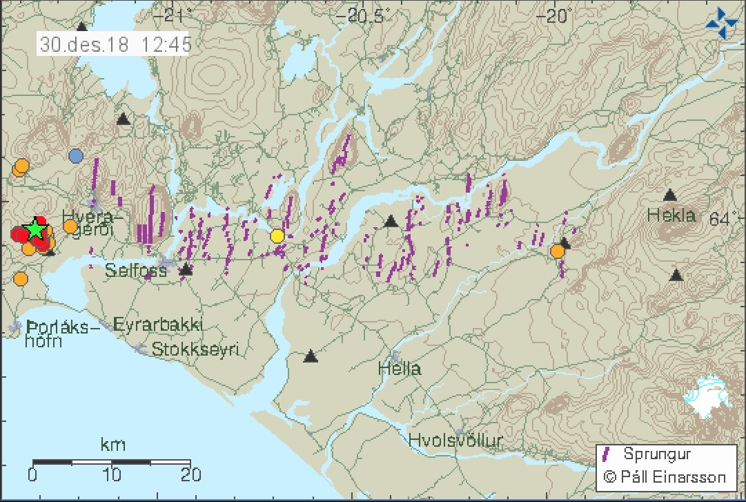 Um 30 eftirskjálftar hafa mælst í kjölfar jarðskjálftans við Skálafell á Hellisheiði í nótt. Skjálftinn var 4,4 að stærð kl. 2:56 og vakti marga Sunnlendinga af værum svefni.
