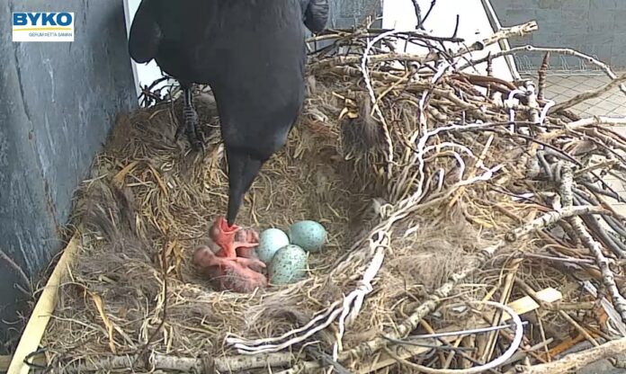 Varpið hjá Bykohröfnunum á Selfossi vekur alltaf mikla athygli en eins og sunnlenska.is greindi frá á dögunum voru sex egg komin í laupinn.