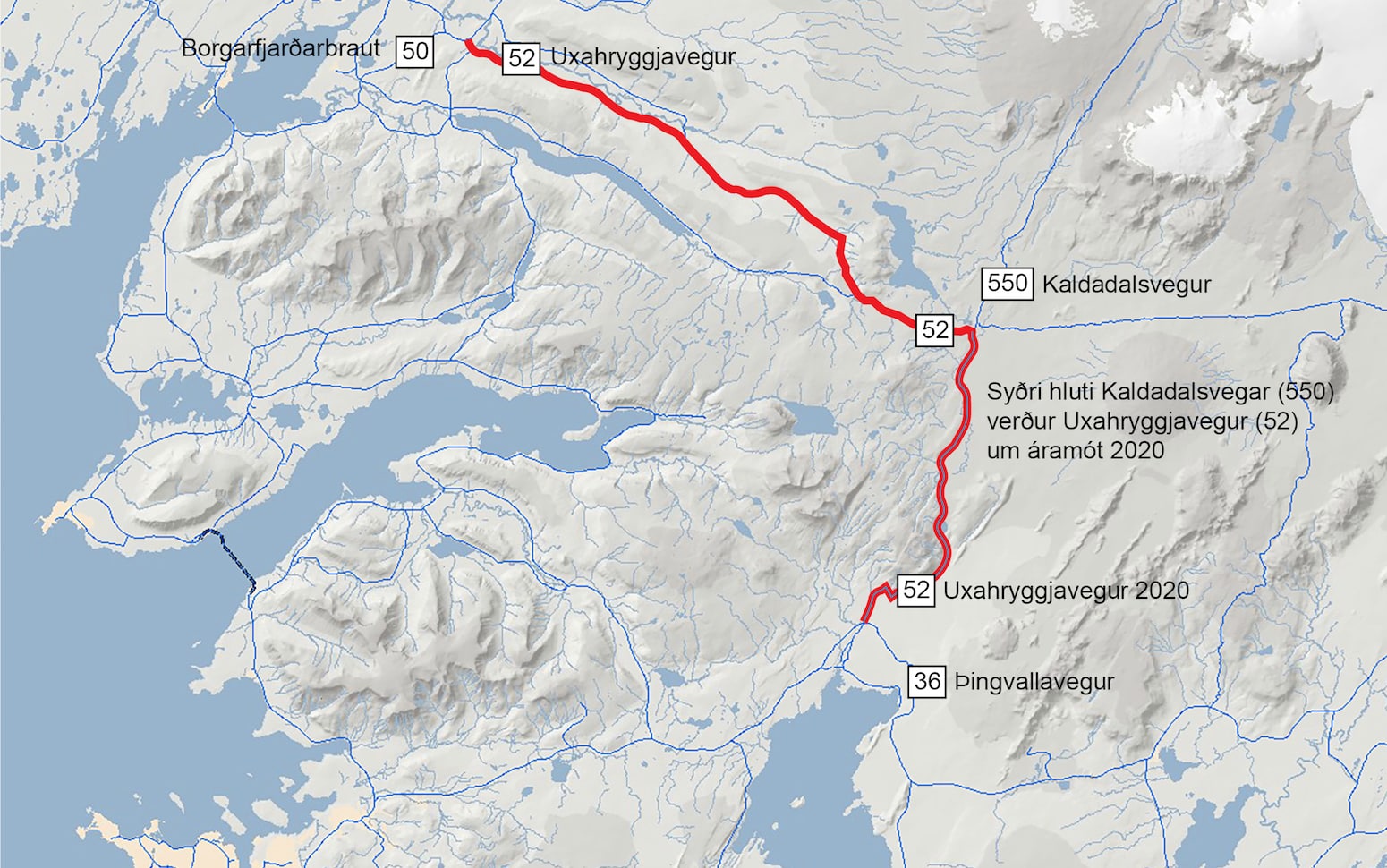Sú breyting mun eiga sér stað um næstu áramót að sá hluti núverandi Kaldadalsvegar (550) sem liggur frá Þingvallavegi (36) að vegamótum við Uxahryggjaveg (52) mun verða hluti Uxahryggjavegar.