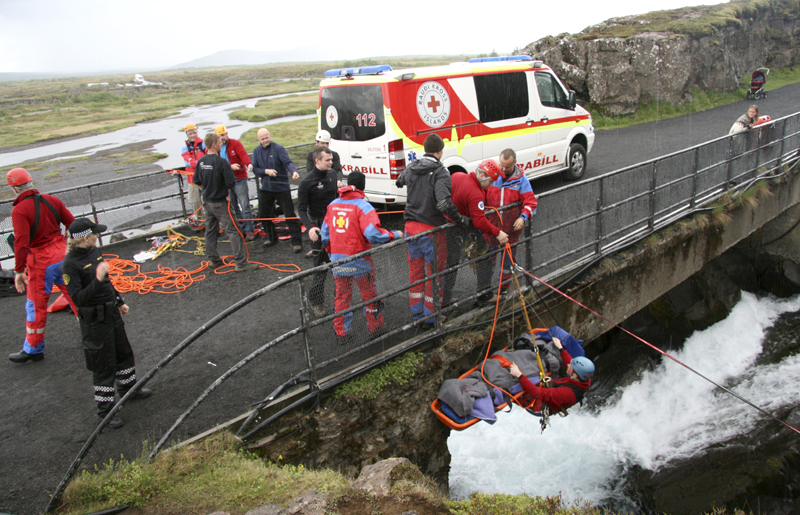 Rétt eftir klukkan tvö barst tilkynning um að maður hefði fallið fram af steinbrúnni sem liggur yfir Öxará, við Drekkingarhyl. Missti hann fótana á syllu, rann niður um fimm metra og lenti illa.