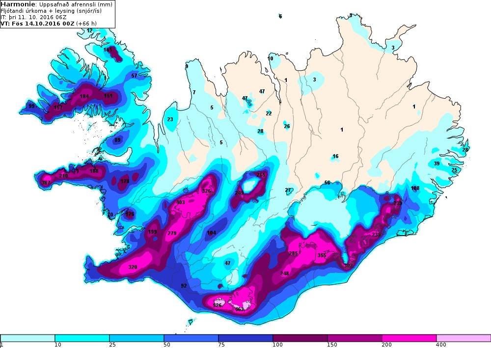 Búist er við miklu vatnsveðri á öllu sunnan- og vestanverðu landinu í nótt, á morgun, miðvikudag og fyrrihluta fimmtudags, meira en 100 mm á sólarhring. Mest verður úrkomuákefðin í nótt og á morgun.