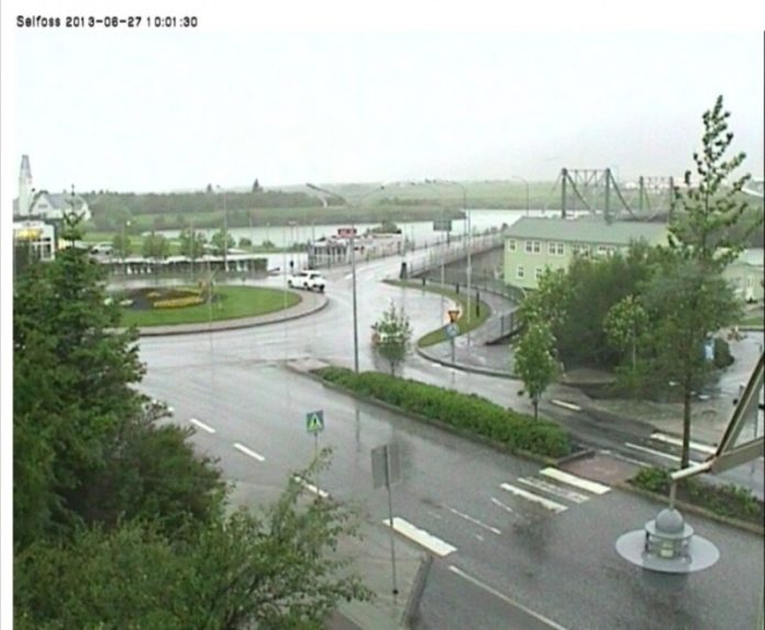Vefmyndavél hefur verið sett upp á Ráðhúsi Árborgar þar sem fylgjast má með beinni útsendingu yfir hringtorgið og Ölfusárbrú,