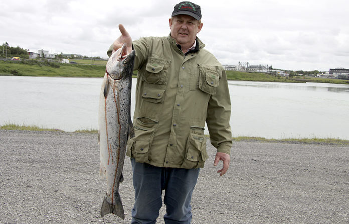 Rúmum fimmtíu mínútum síðar landaði Gunnar Örn Jónsson, fulltrúi sýslumanns á Selfossi, fyrsta laxinum á miðsvæðinu. Það var 14 punda fiskur sem tók rauða Francis.