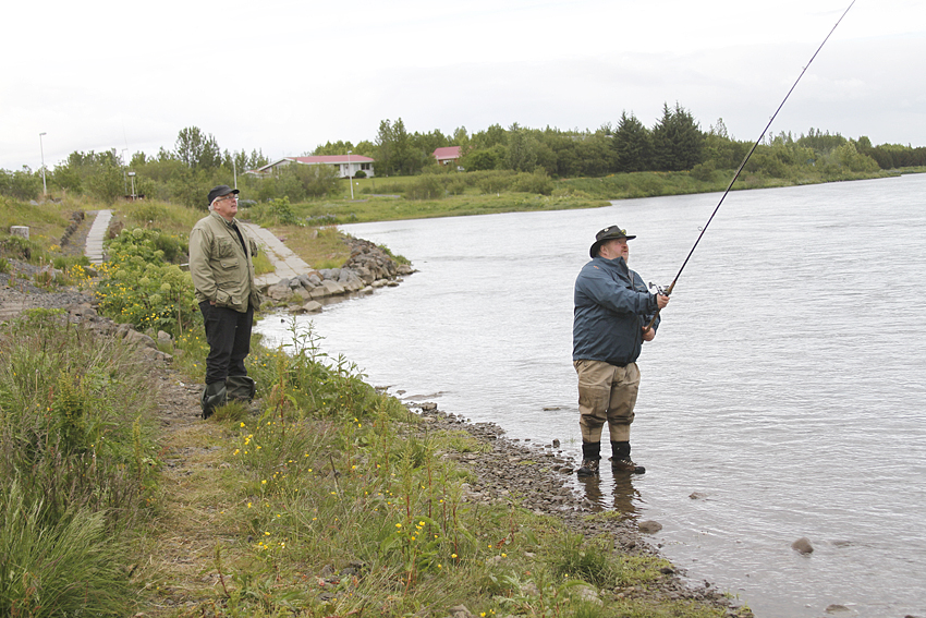 Á myndinni eru tveir reynslukappar, þeir Bogi Karlsson og Gunnar Egilsson sem náðu sitthvorum laxinum úr Ölfusánni í gær. Hrygna Boga var heldur stærri, eða 6,1 kíló en hún fékkst á miðsvæðinu, svokallaða.
