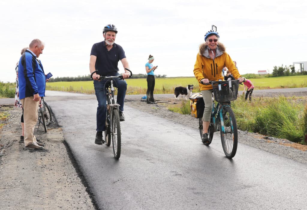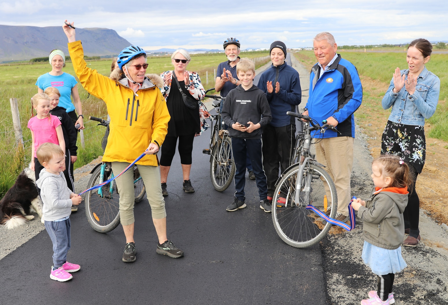 Sigríður Kristín Jóhannsdóttir í Stóru-Sandvík klippti á borða á stígnum við Strokkhól og vígði stíginn þar með formlega. Sigríður hefur hjólað til vinnu á Selfossi í yfir tuttugu ár.