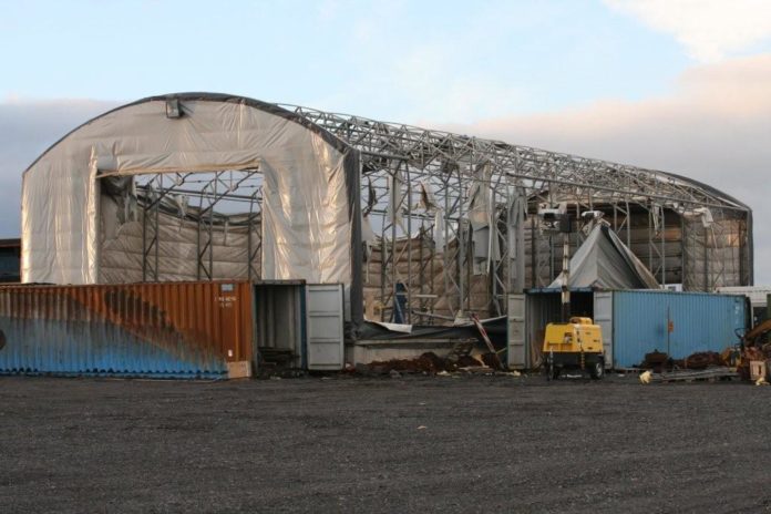 Stórt tjald á járngrind sem starfsmenn Suðurverks nota undir verkstæði við Landeyjahöfn splundraðist í hvassviðrinu í lok síðustu viku.