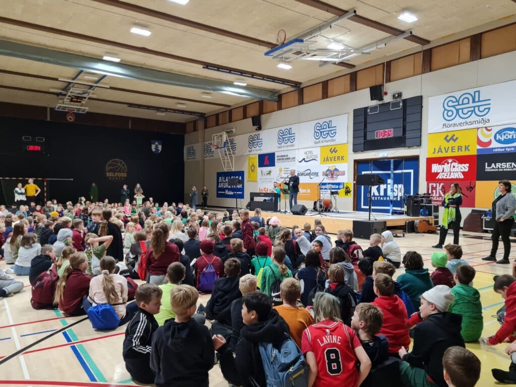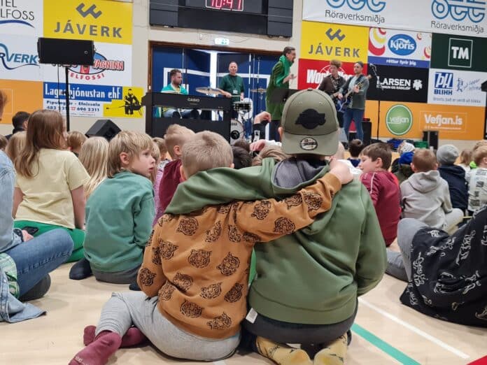 Nemendur og starfsfólk skólans kom svo saman í íþróttasal þar sem starfsmannahjómsveitin Í grænum fötum spilaði og áhorfendaskarinn söng með af mikilli innlifun og krafti.