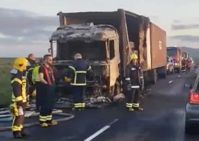„Bílstjórinn varð var við eitthvað skrítið og stoppaði og þá var kominn upp eldur í bílnum. Hann komst út en þegar við komum á vettvang þá var ökumannsrýmið alelda. Kassinn á bílnum skemmdist einnig en tengivagn sem var aftan í bílnum slapp,“ sagði Sigurður Gýmir Bjartmarsson, varaslökkviliðsstjóri hjá slökkviliðinu í Vík, í samtali við sunnlenska.is, en útkallið barst klukkan 20:09.