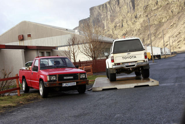 Heimamenn náðu að stoppa pallinn og forða frekari tjóni með því að aka stórum jeppa upp á pallinn.