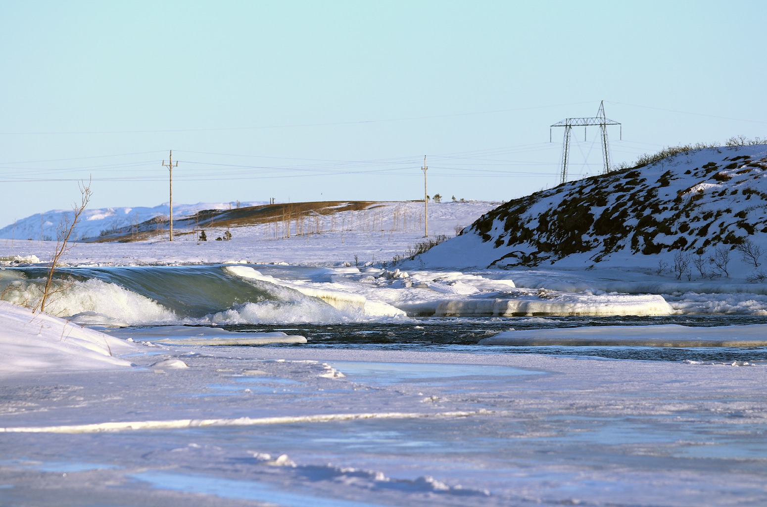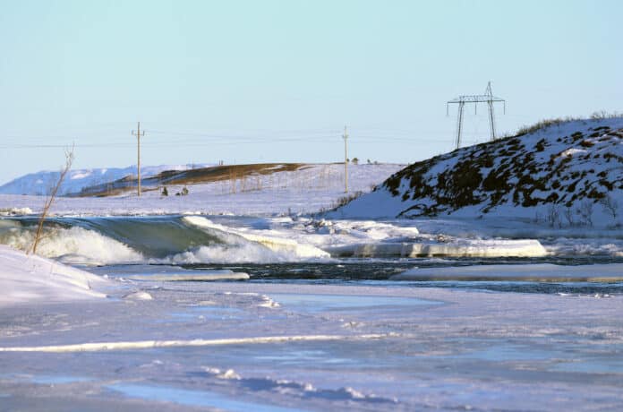 Áin er frosin svo að vatn rennur ekki yfir veginn en frosið yfirborðið virðist lyftast jafnt og þétt.