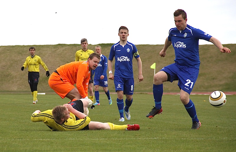 Þegar leið á fyrri hálfleikinn þyngdust hins vegar sóknir Ægis og þeir urðu beittari fram á við. Á 28. mínútu fékk Ægir hornspyrnu þar sem Haukur Már Ólafsson hitti ekki boltann í galopnu skallafæri á markteignum og í kjölfarið sigldi boltinn framhjá hverjum leikmanninum á fætur öðrum í markteignum.