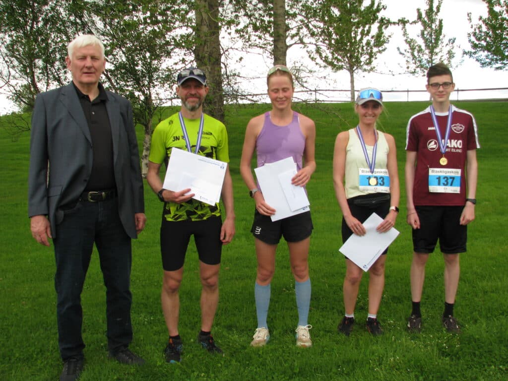 Það var Snæbjörn Sigurðsson í Efstadal sem afhenti verðlaun, en hann vann drengjaflokkinn í fyrsta Bláskógaskokkinu árið 1972. Auk sérverðlauna voru veitt svokölluð útdráttarverðlaun sem voru í boði Run2. Þessum fyrirtækjum, auk Fontana á Laugarvatni er þakkaður stuðningurinn við hlaupið.