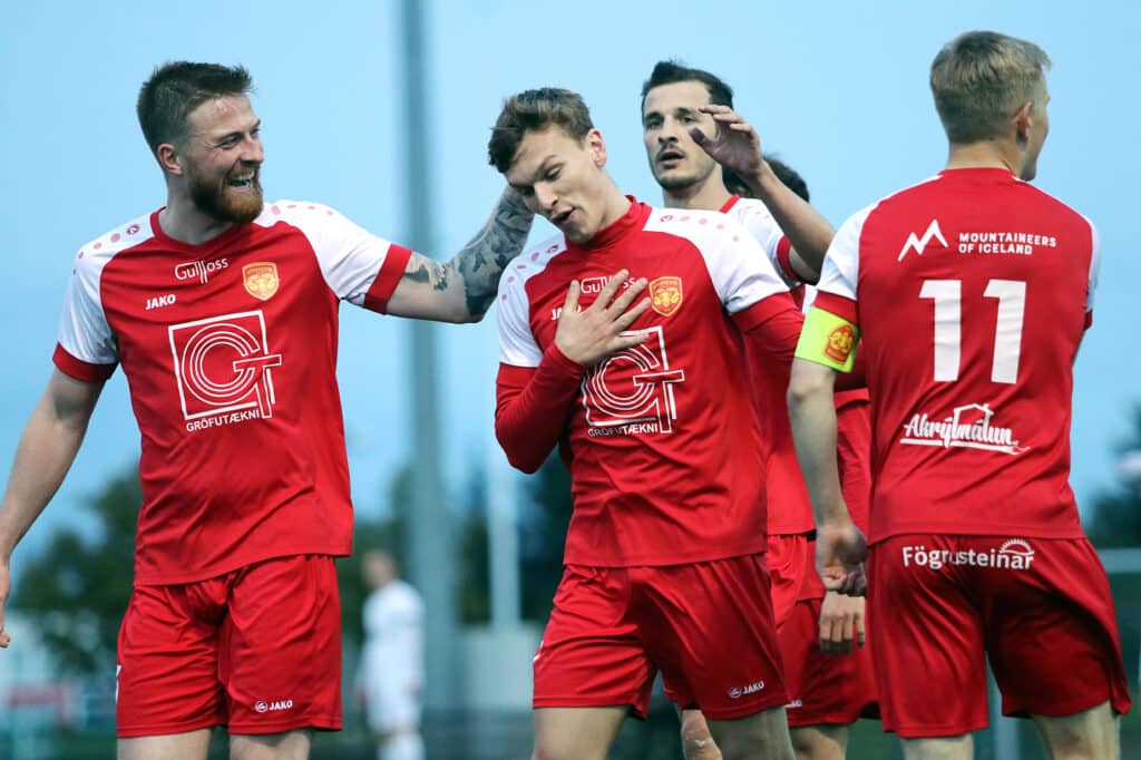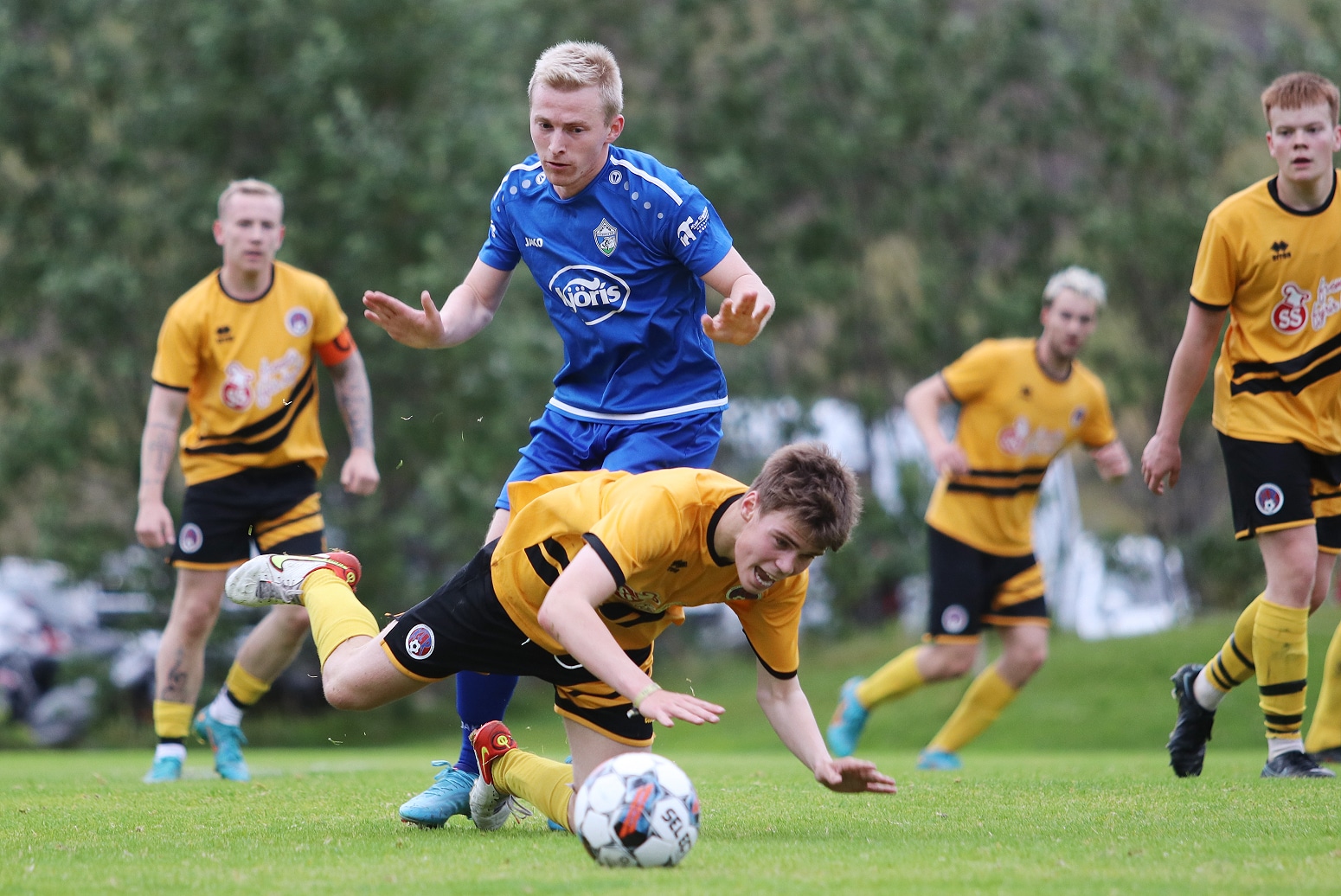 Það var öllu rólegri stemning á Selfossi þar sem Árborg og Uppsveitir mættust. Gestirnir í #Gíslisarmy voru sterkari í fyrri hálfleik og George Razvan kom þeim yfir á 20. mínútu með góðu marki og hann var svo nálægt því að skora aftur þegar hann tók bakfallsspyrnu í þverslána. Staðan var 0-1 í hálfleik og leikurinn var í járnum í upphafi seinni hálfleiks. Razvan var aftur á ferðinni á 66. mínútu með sínu 40. marki í deildinni í sumar en fljótlega veiddi Elvar Orri Sigurbjörnsson boltann af varnarmanni Uppsveita og skoraði gott mark fyrir Árborg. Vonarneisti Árborgar slökknaði hins vegar fimm mínútunum síðar þegar Kristinn Sölvi Sigurgeirsson skoraði eitt af mörkum ársins. Hann fékk boltann við miðju og lék á tvo miðjumenn áður en hann saltaði varnarlínu Árborgar eins og hún lagði sig og smurði boltanum svo með jörðinni i netið. Magnað mark. Uppsveitir sóttu ákaft á lokasprettinum og áttu nóg inni og í uppbótartímanum kórónaði Razvan þrennuna og 1-4 sigur Uppsveita.