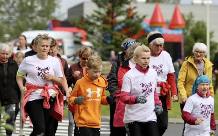 Sjóvá Kvennahlaup ÍSÍ er haldið í dag á yfir 80 stöðum á landinu. Það var líf og fjör á Selfossi í morgun þegar hlaupið var ræst og fjöldi kvenna hljóp með bros á vör og sól í hjarta.