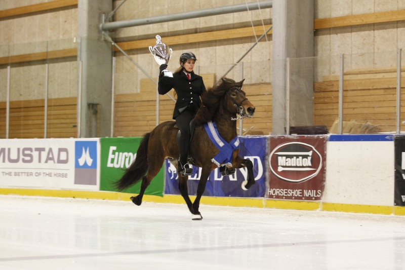Það var hörð baráttan á toppnum í A-úrslitunum. John Kristinn Sigurjónsson og Brynja frá Bakkakoti komu mjög fersk uppúr B-úrslitunum og voru efst eftir hægt tölt og hraðabreytingar. En á fegurðartöltinu sýndu Sara Ástþórsdóttir og Díva frá Álfhólum hvers vegna hryssan er með 10 fyrir tölt í kynbótadómi og seig framúr keppinautum sínum.