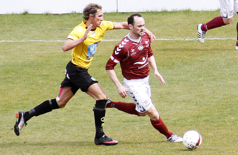 En fimm mínútum síðar komust gestirnir yfir aftur með marki úr vítaspyrnu. Dómari leiksins taldi að brotið hafði verið á Hirti Júlíusi innan teigs og Arnar Már Guðjónsson skoraði úr spyrnunni.