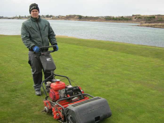 Flatirnar á Svarfhólsvelli við Selfoss voru slegnar með handsláttuvél í gær. Flatirnar eru orðnar loðnar, ótrúlega þéttar og fallegar miðað við árstíma.