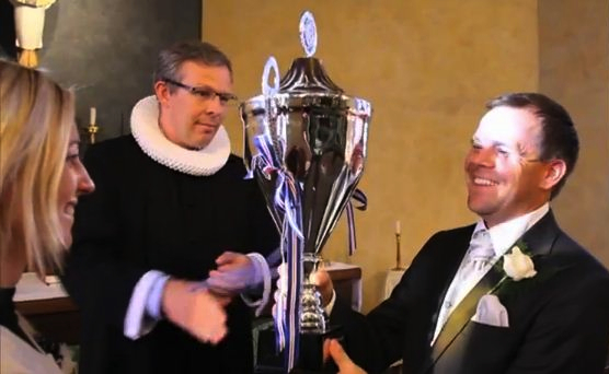 Hlynur Geir Hjartarson úr Golfklúbbi Selfoss varð stigameistari á Eimskipsmótaröðinni í ár. Hann gat ekki tekið við titlinum í lokahófi GSÍ í gærkvöldi þar sem hann kvæntist í gær en Hlynur fékk bikarinn hins vegar afhentan með eftirminnilegum hætti.