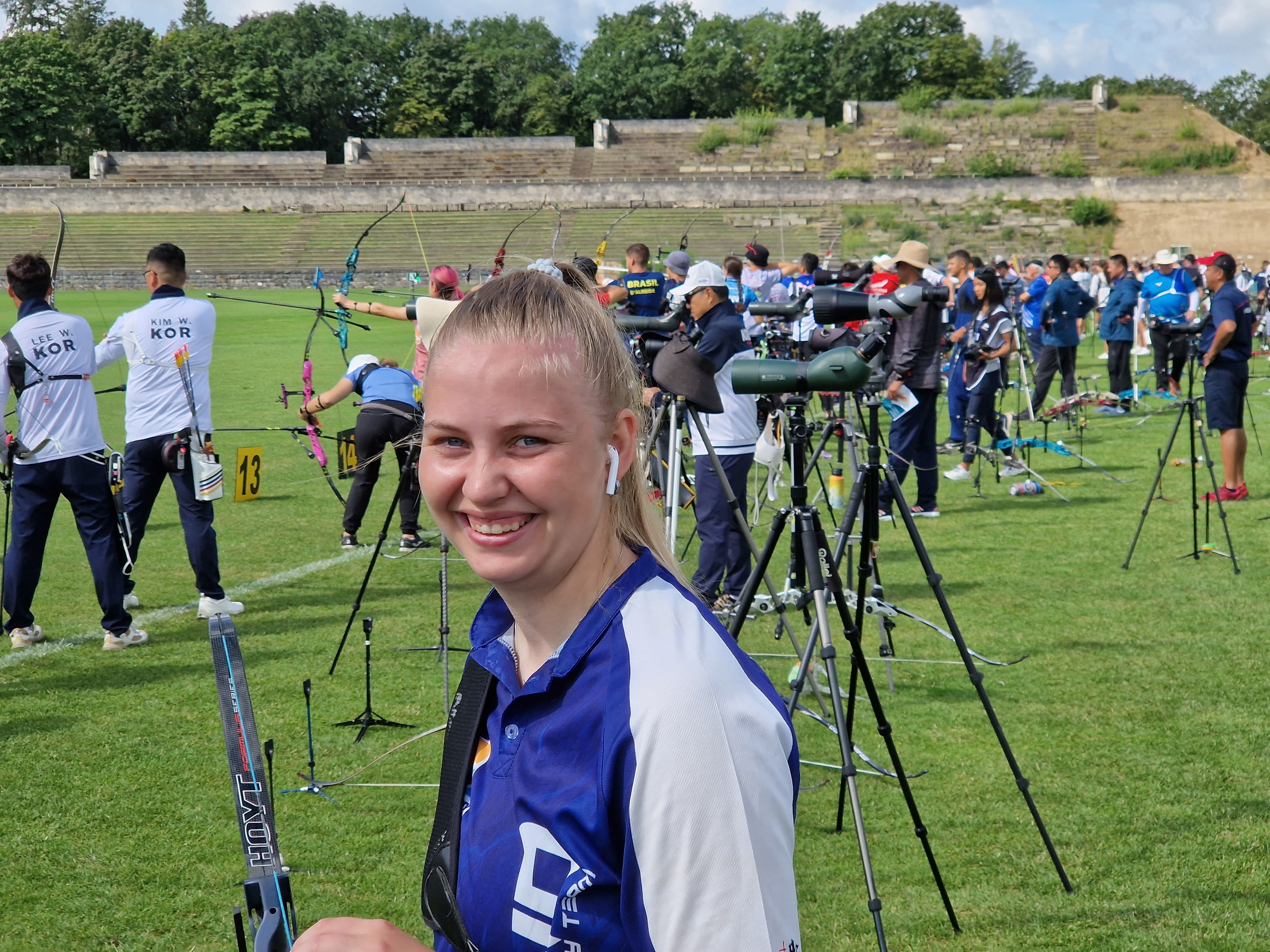Valgerður E. Hjaltested frá Hæli í Hreppum keppti á sínu fyrsta heimsmeistaramóti í bogfimi utandyra í Berlín í Þýskalandi í síðustu viku.
