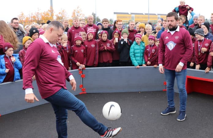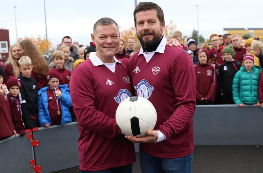 Það var vel til fundið að félagar Benna úr fótboltanum, þeir Valli Reynis og Gaui Tobba, tóku fyrsta opinbera leikinn á vellinum. Það hefur mikið verið sungið í sumar að Valli Reynis sé miklu betri en Gaui Tobba en viðureign þeirra lauk með 1-1 jafntefli og voru allir sáttir í leikslok.