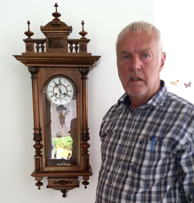 Þórður G. Árnason á Selfossi byrjaði að safna klukkum árið 2001, sú fyrsta var keypt í Prag og er meðfylgjandi mynd af Þórði og þeirri klukku.