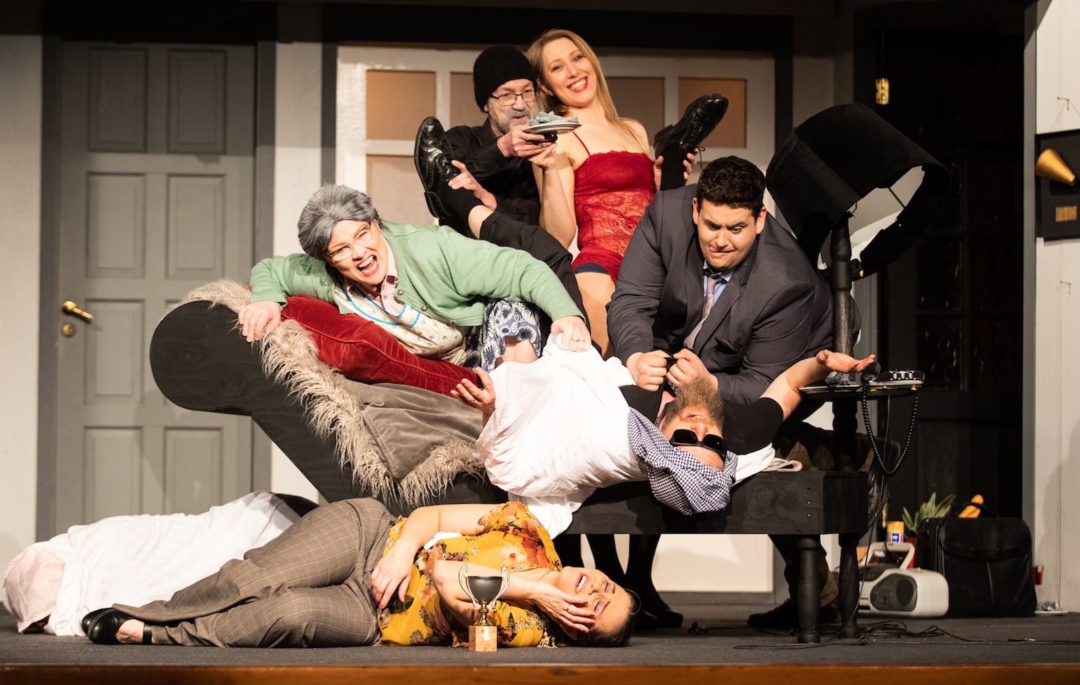 Leikritið, sem er þýtt og staðfært af Gísla Rúnari Jónssyni, fjallar um leikhóp sem stendur að æfingum og sýningum á leikritinu Nakin á svið. Í upphafi sýningarinnar er hópurinn á lokaæfingu á verkinu en eftir því sem sagan vindur upp á sig fara ýmsir brestir að koma í ljós og í þriðja þætti er hópurinn kominn á lokasýningu í Aratungu og má glöggt merkja að umburðarlyndi er nú af skornum skammti og leikhópurinn orðinn tættur og lúinn á samstarfinu.