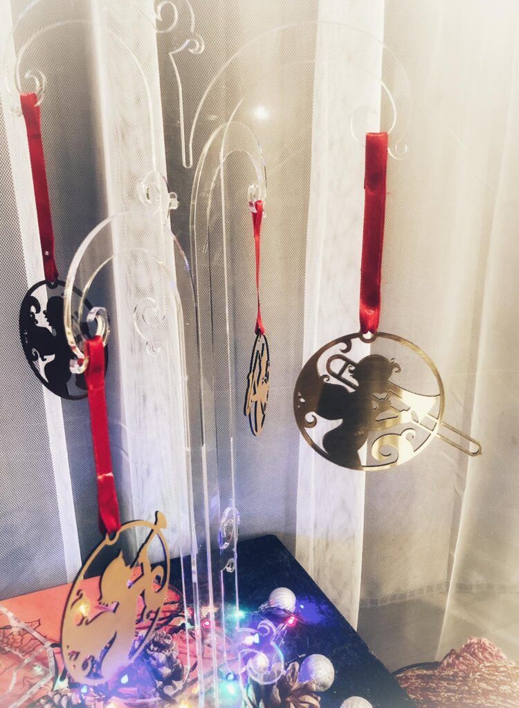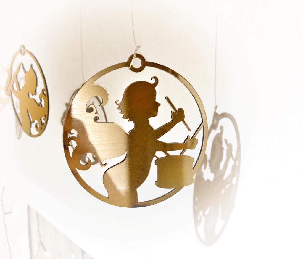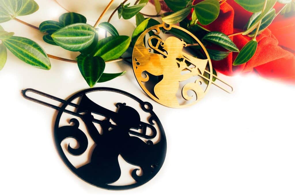 Óróarnir eru aldrei eins milli ára en eiga það sameiginlegt að það er engill sem heldur á hljóðfæri. „Fyrsti óróinn sem kom út árið 2019 innihélt trompet. Það var einhvern vegin auðveld ákvörðun þar sem algengt er að sjá engla blása í trompeta í tengslum við ýmislegt jólaskraut. Þar að auki er trompet nokkuð þekkt hljóðfæri og auðunnið í skuggamynd.“